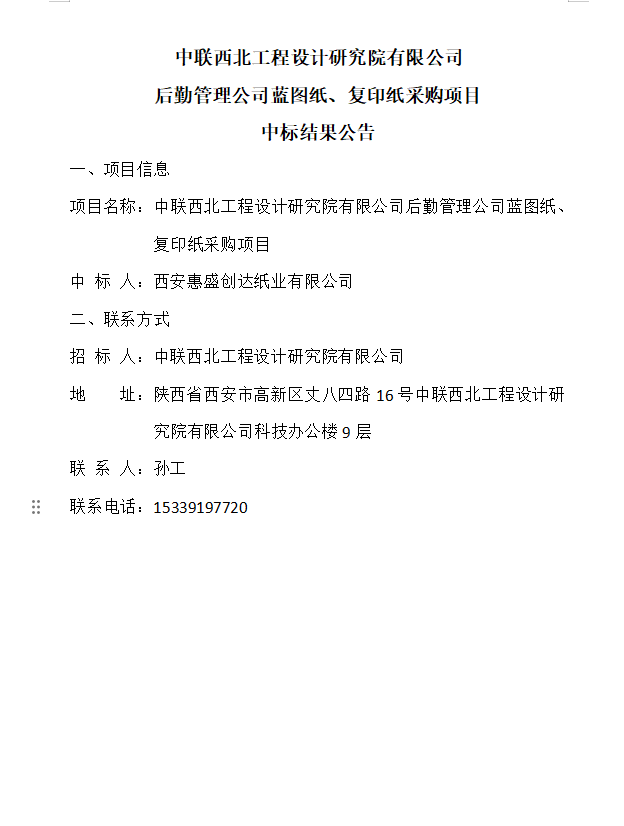 中联西北工程设计研究院有限公司后勤管理公司蓝图纸、复印纸采购项目中标结果公告