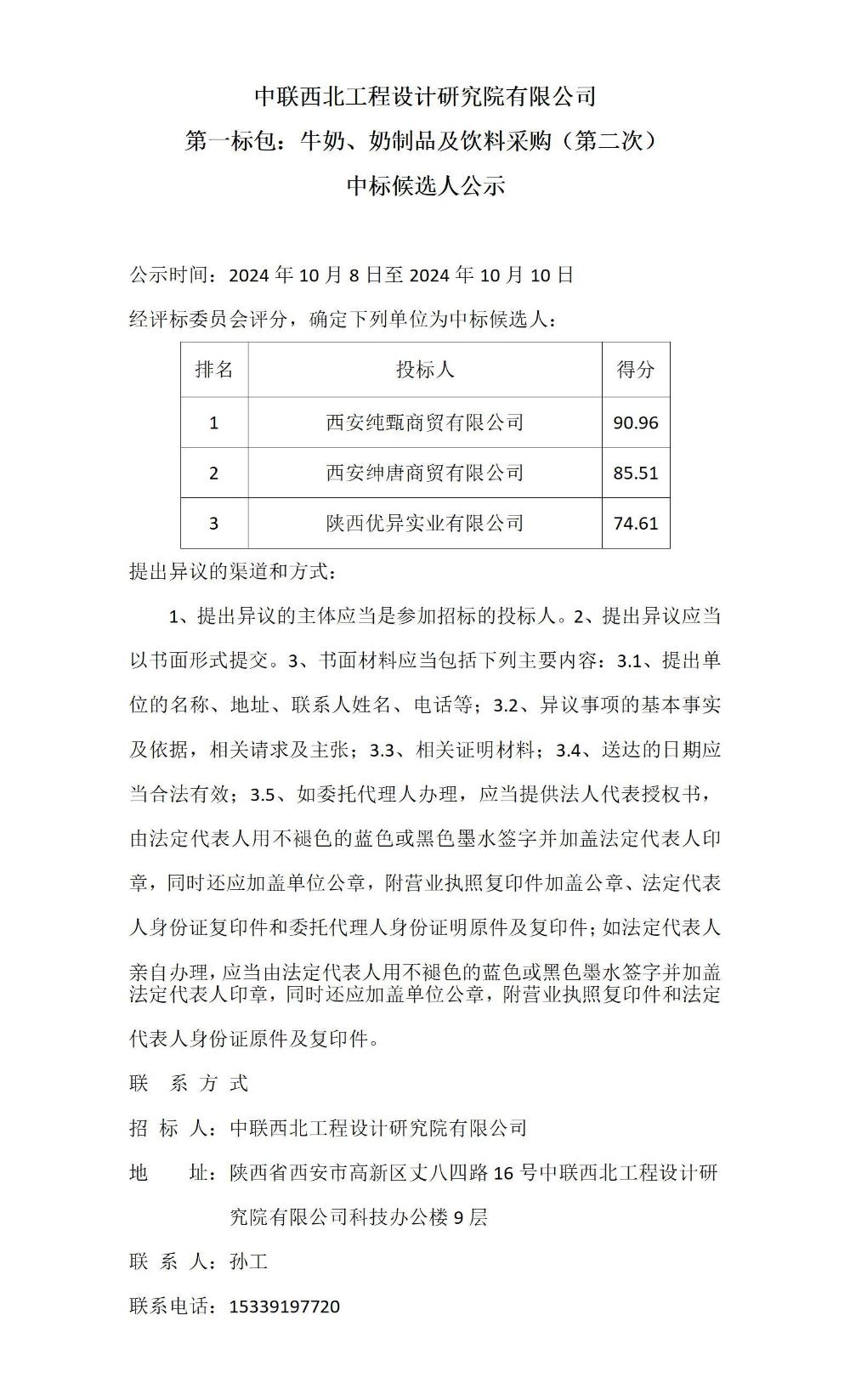 中联西北工程设计研究院有限公司第一标包:牛奶、奶制品及饮料采购(第二次)中标候选人公示