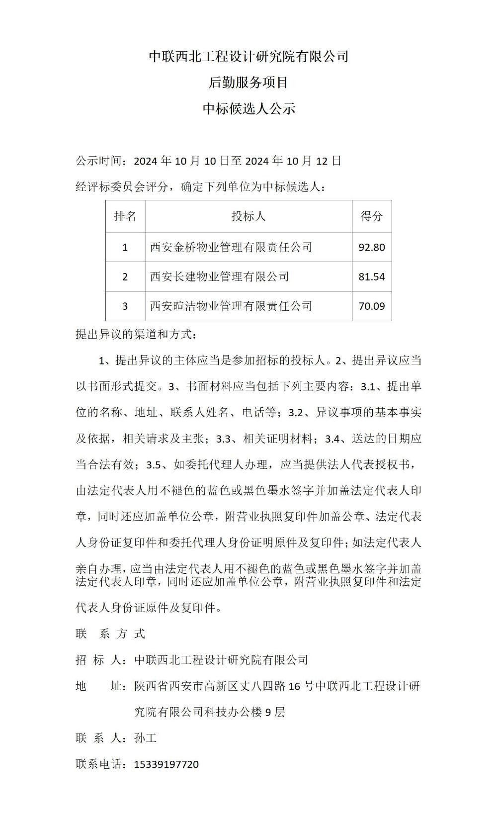 中联西北工程设计研究院有限公司后勤服务项目中标候选人公示