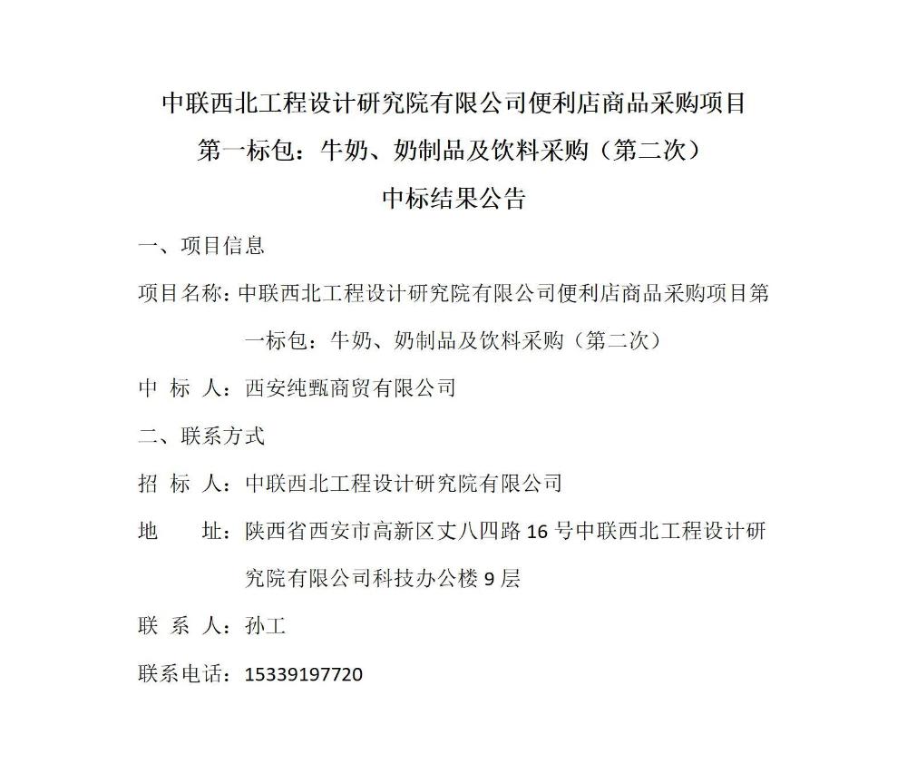 中联西北工程设计研究院有限公司便利店商品采购项目第一标包:牛奶、奶制品及饮料采购(第二次)中标结果公告