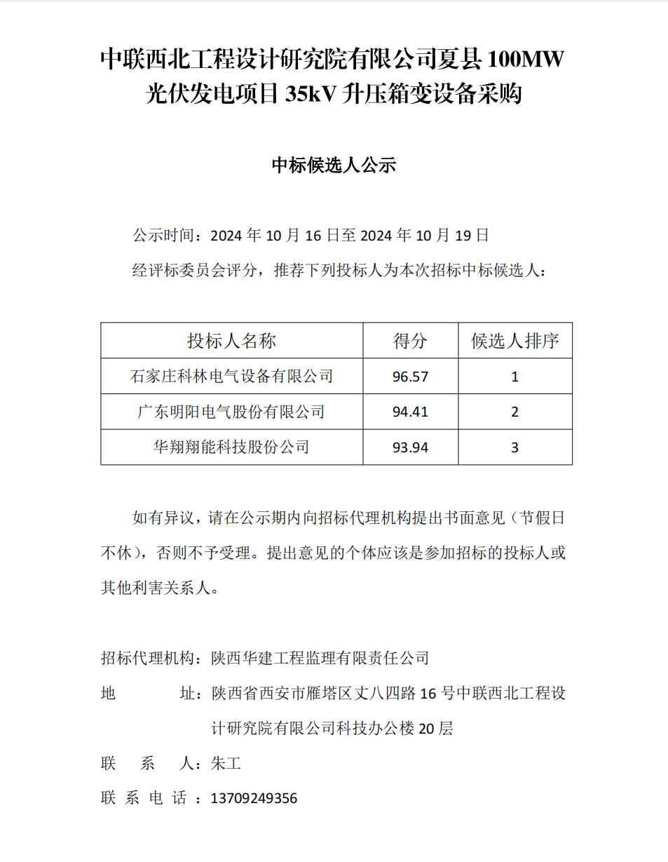 中联西北工程设计研究院有限公司夏县100MW光伏发电项目35kV升压箱变设备采购中标候选人公示