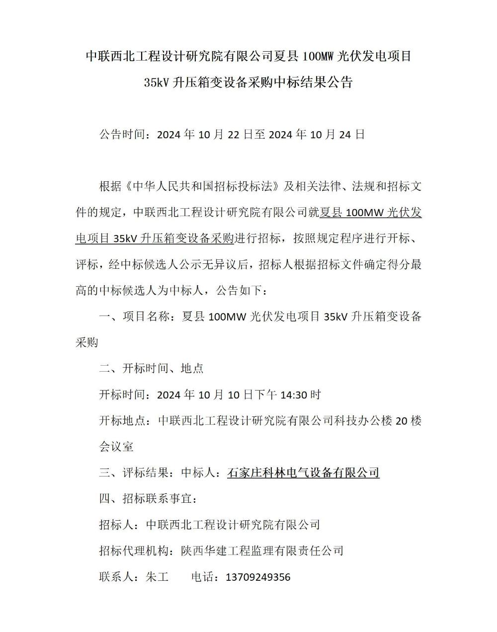 中联西北工程设计研究院有限公司夏县100MW光伏发电项目35kV升压箱变设备采购中标候选人公示