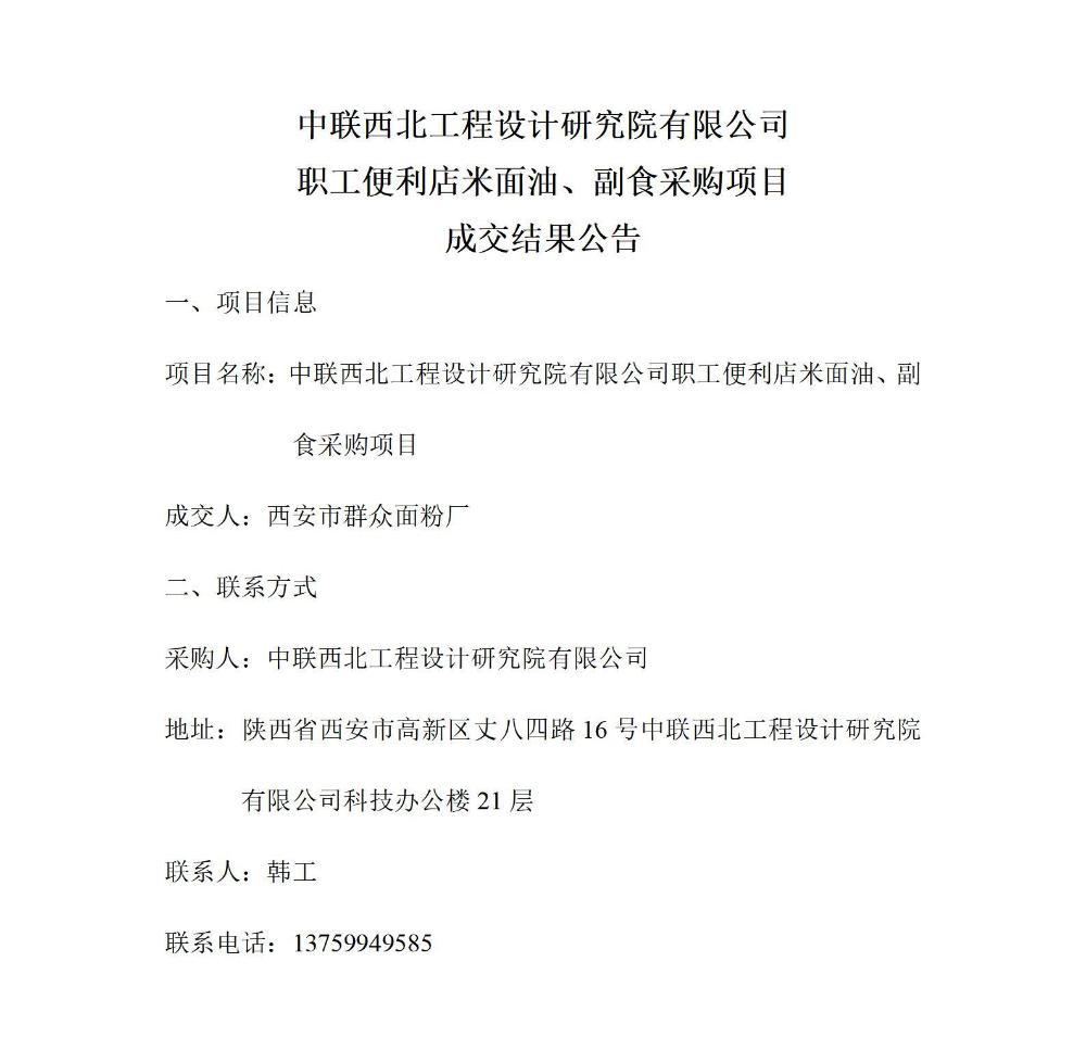 中联西北工程设计研究院有限公司职工便利店米面油、副食采购项目成交结果公告