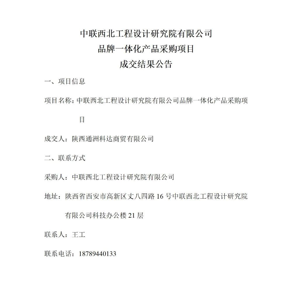 中联西北工程设计研究院有限公司品牌一体化产品采购项目成交结果公告