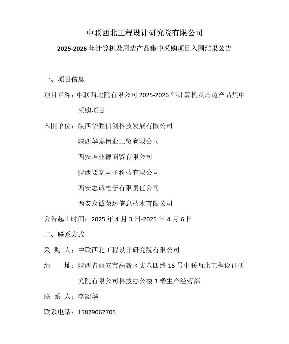 中联西北工程设计研究院有限公司2025-2026年计算机及周边产品集中采购项目入围结果公告
