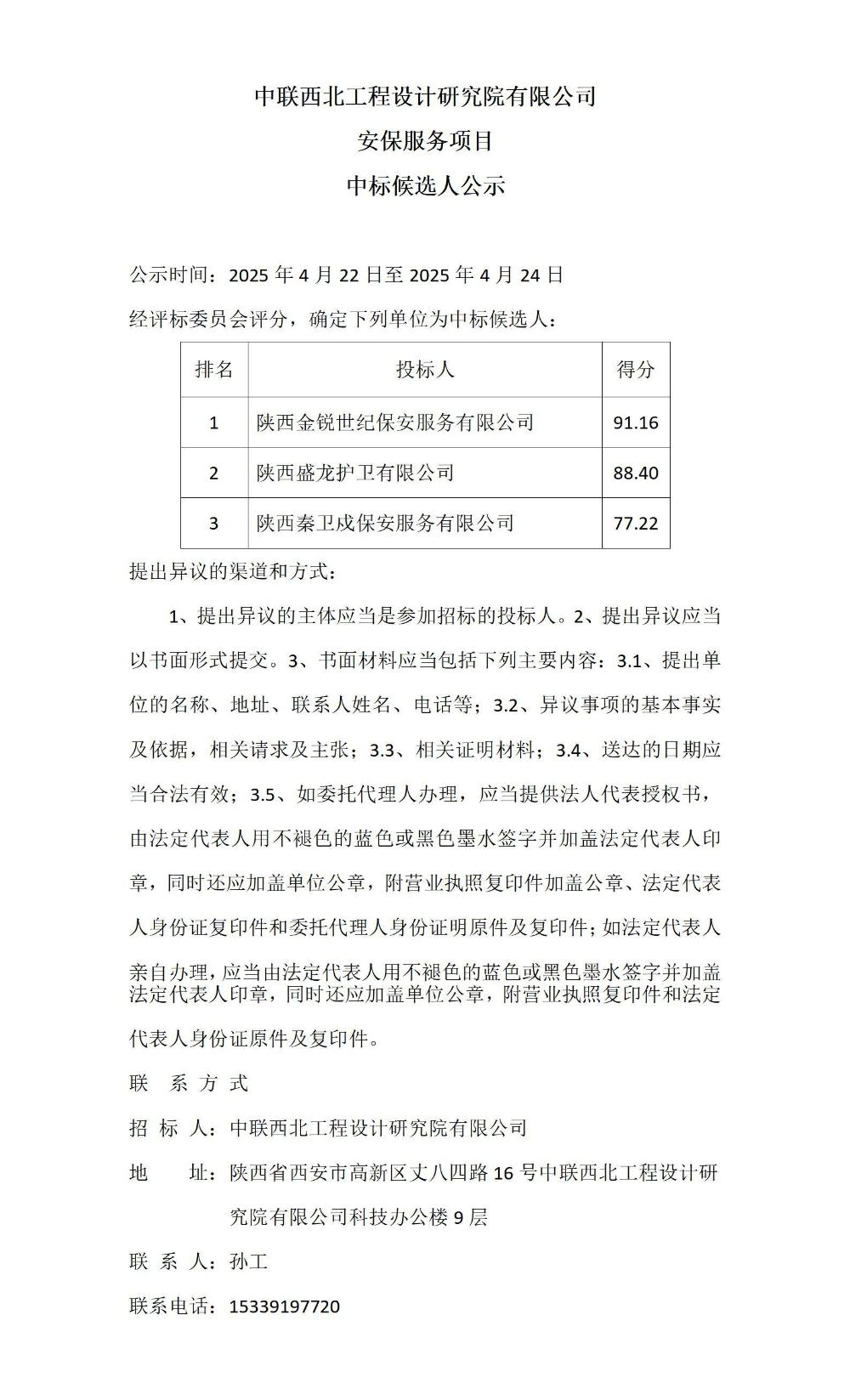 中联西北工程设计研究院有限公司 安保服务项目中标候选人公示