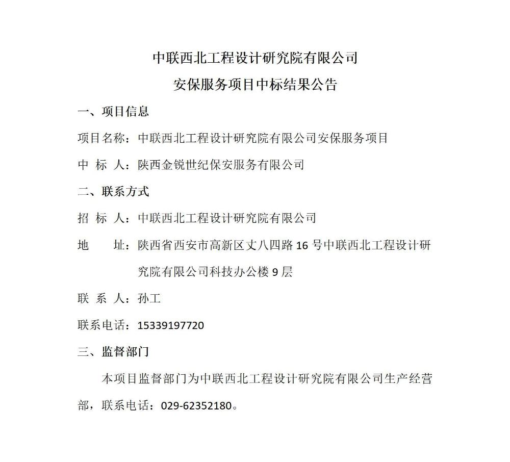 中联西北工程设计研究院有限公司安保服务项目中标结果公告