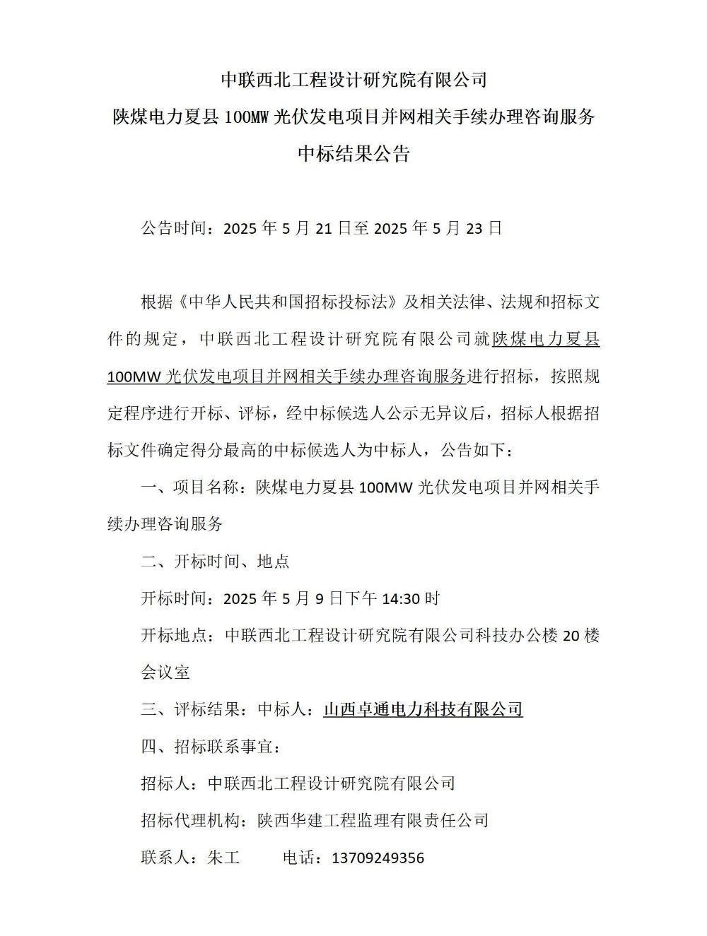 中联西北工程设计研究院有限公司陕煤电力夏县100MW光伏发电项目并网相关手续办理咨询服务中标结果公告