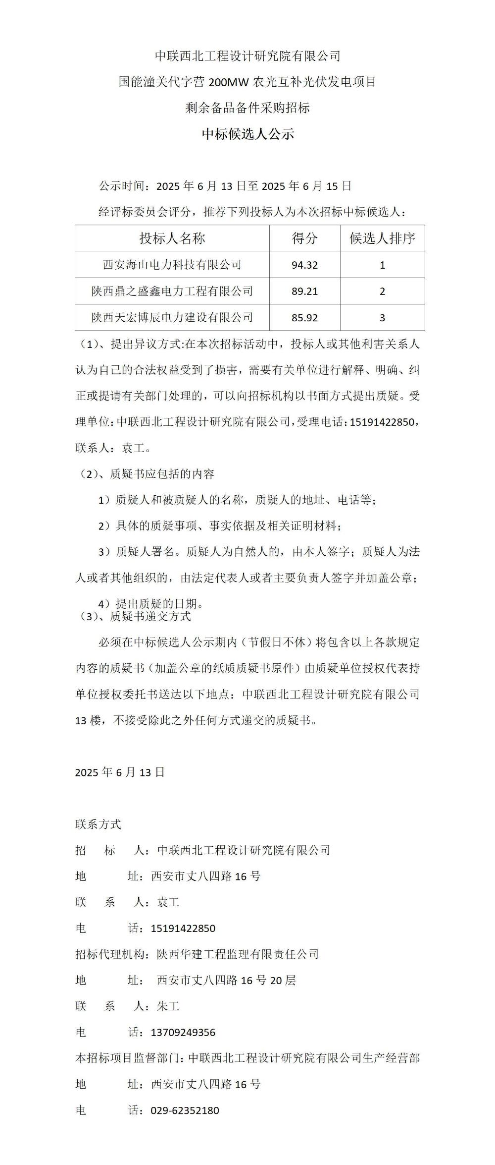 中联西北工程设计研究院有限公司国能潼关代字营200MW农光互补光伏发电项目剩余备品备件采购招标中标候选人公示