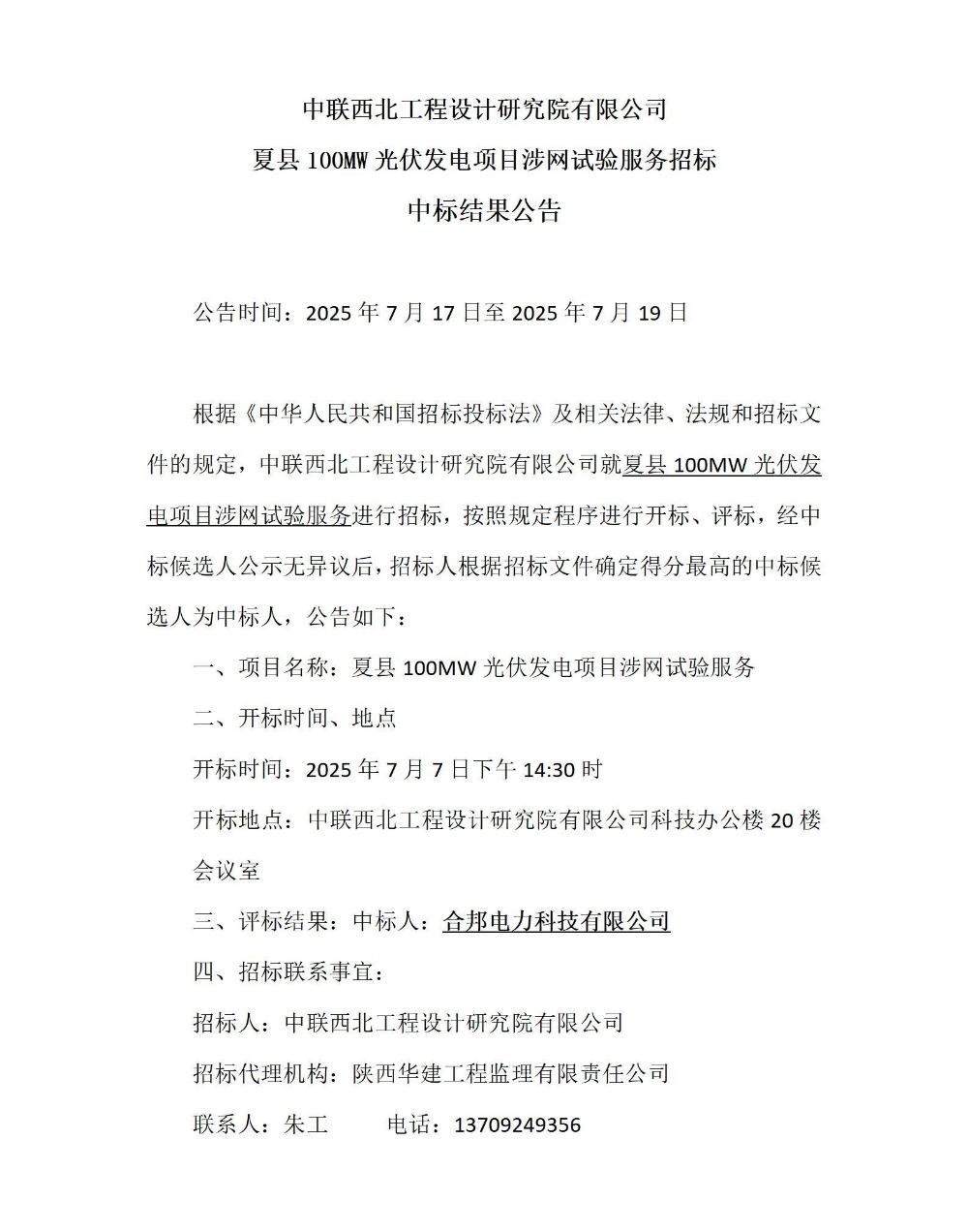 中联西北工程设计研究院有限公司夏县100MW光伏发电项目涉网试验服务招标中标结果公告