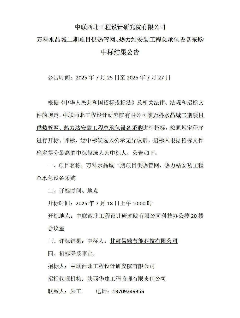 中联西北工程设计研究院有限公司万科水晶城二期项目供热管网、热力站安装工程总承包设备采购中标结果公告