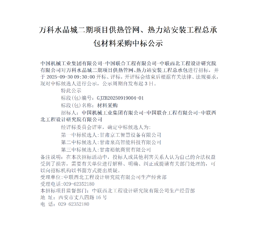 万科水晶城二期项目供热管网、热力站安装工程总承包材料采购中标公示
