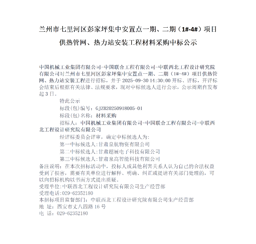 兰州市七里河区彭家坪集中安置点一期、二期(1#-4#)项目供热管网、热力站安装工程材料采购中标公示