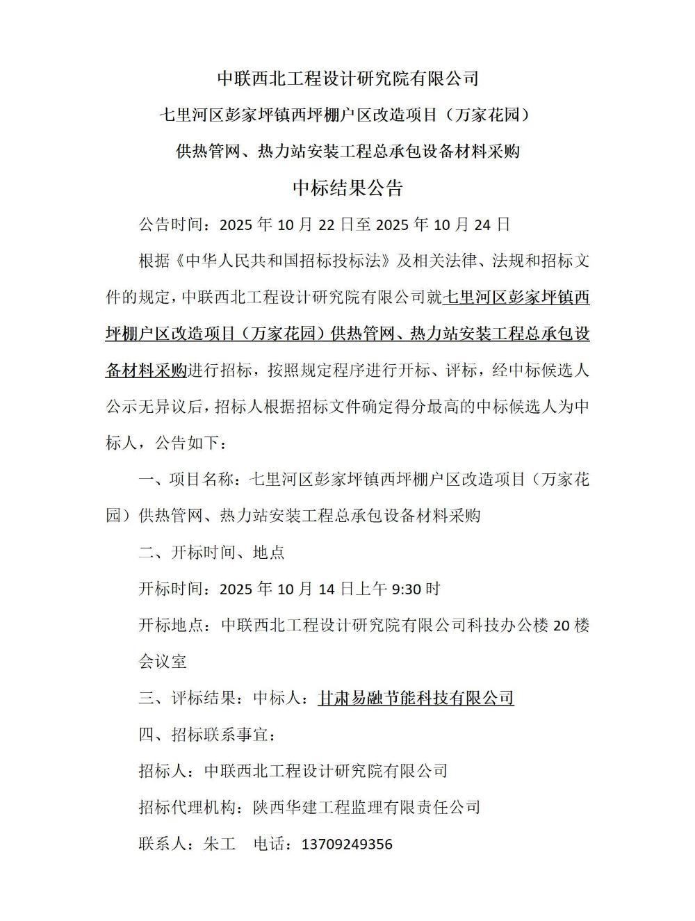 七里河区彭家坪镇西坪棚户区改造项目(万家花园)供热管网、热力站安装工程总承包设备材料采购中标结果公告