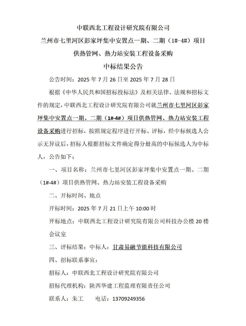 中联西北工程设计研究院有限公司兰州市七里河区彭家坪集中安置点一期、二期(1#-4#)项目供热管网、热力站安装工程设备采购中标结果公告