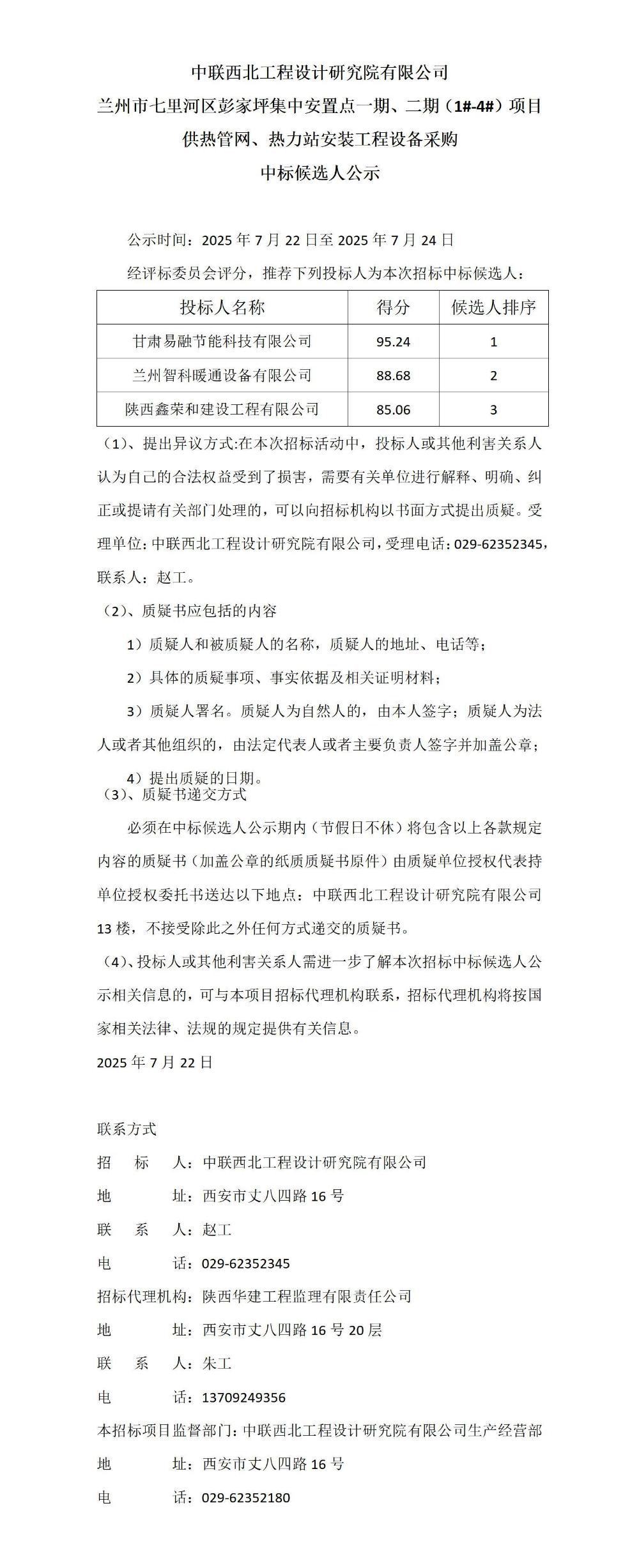 中联西北工程设计研究院有限公司兰州市七里河区彭家坪集中安置点一期、二期(1#-4#)项目供热管网、热力站安装工程设备采购中标候选人公示